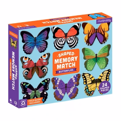 Butterflies Shaped Memory Match from Mudpuppy includes 24 shaped pieces featuring brightly coloured butterflies to match.