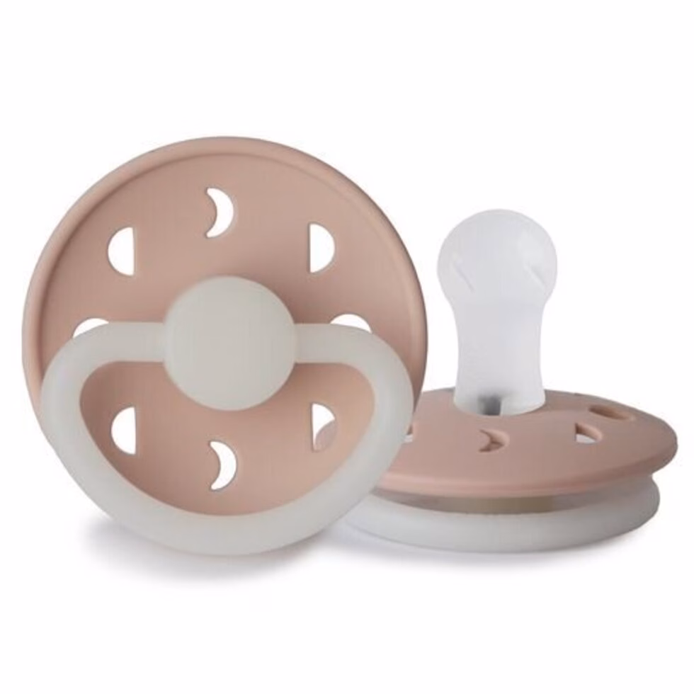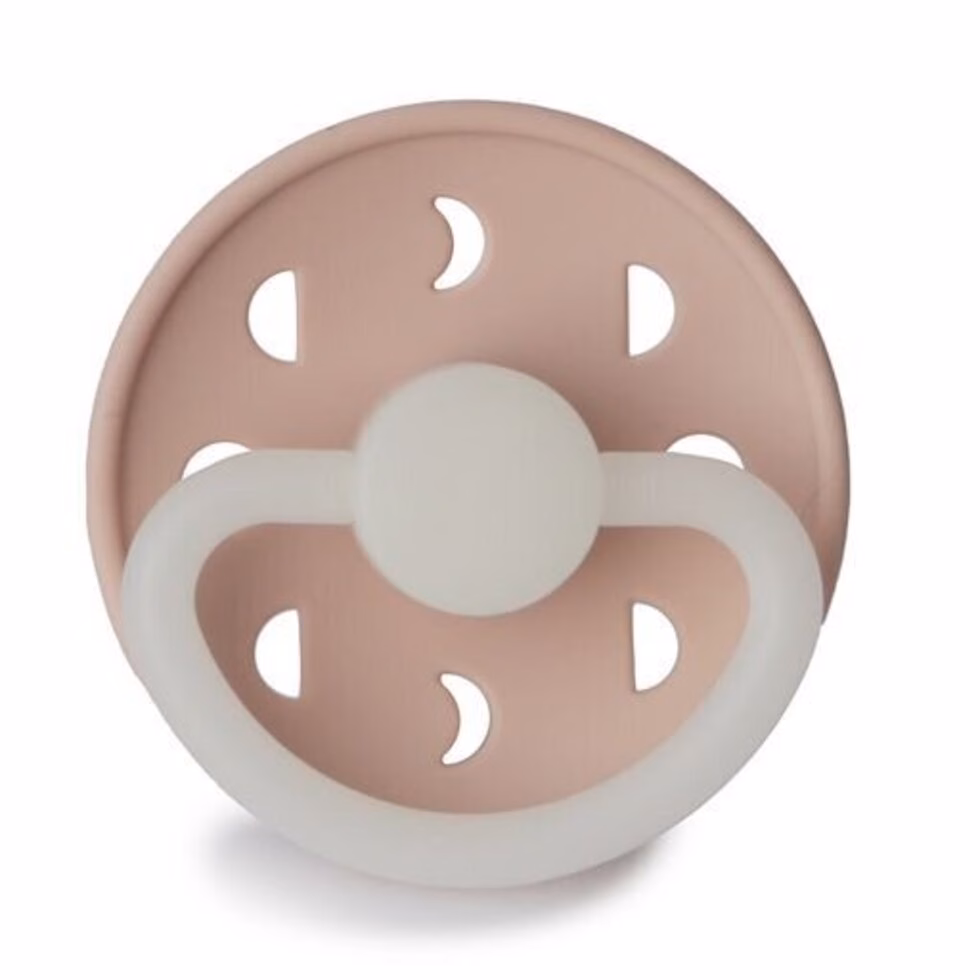 FRIGG Night pacifier with a glow-in-the-dark function. The handle and knob will glow in the dark and solve the challenge of finding and placing your baby’s pacifier in the middle of the night.