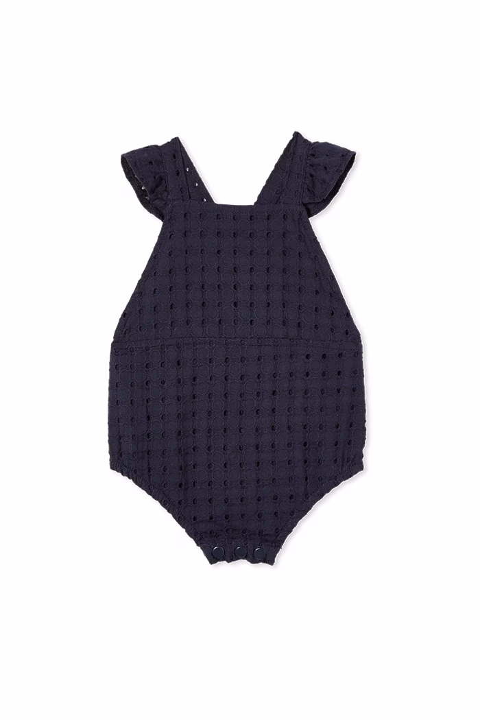Milky Clothing Navy Broderie Baby Playsuit is a beautiful classic summer outfit for your little one this season. With a little more volume than a romper, the Playsuit allows for extra comfort on those warm days especially as it is made from 100% Cotton. Along with cross over straps, you will find extra button holes to allow some room to grow.