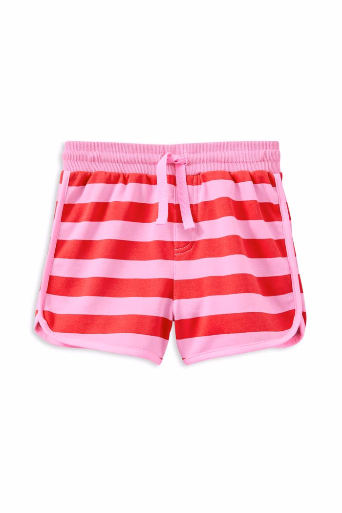 Milky Clothing Cherry Stripe Short. Bright, bold, and built for summer fun. The Milky Clothing Cherry Stripe Short is a comfy must-have for warm weather. Featuring sporty red and pink stripes and made from soft unbrushed fleece, these shorts are perfect for play, park hangs, or lounging at home. The elastic waistband with functional drawcord makes for easy dressing, and the relaxed fit allows for all-day movement. Pair with the matching Cherry Stripe Sweat or mix and match with your fave Milky tees.