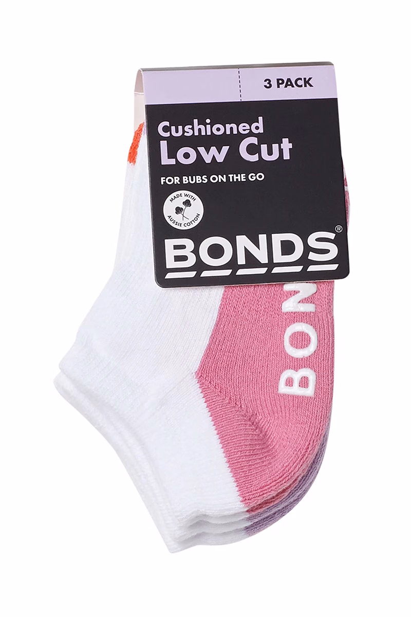 Our Baby Logo Cushioned Low Cut Socks 3 Pack is made from soft and breathable Aussie cotton with classic BONDS styling. These baby socks feature grippy soles that won’t slip for bubs on the go and are extra thick for comfiness.