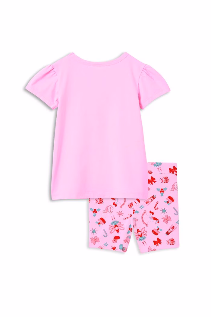These PJs are a bike short style and cap sleeve tee combo on a pink base. With a center front festive Christmas print. The perfect sleepwear for those Christmas eve/morning photos.