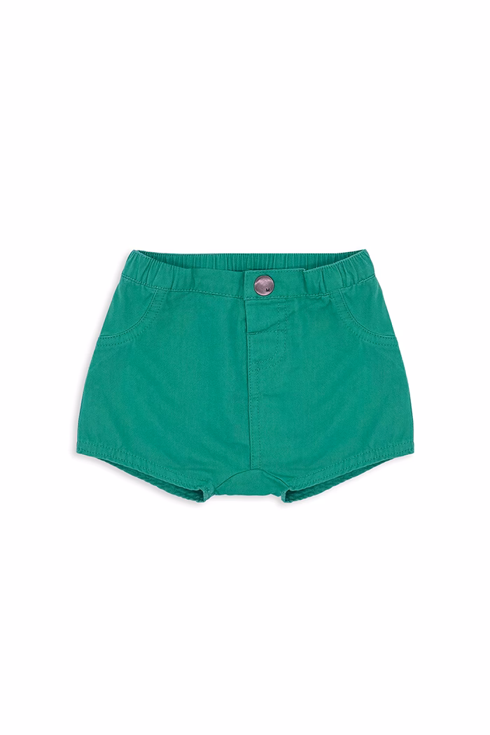 Made from 100% cotton in a Fern Green cotton, these baby shorts are sure to become a wardrobe staple. With a mock fly front and a stud for extra detail, plus a functional back pocket for authenticity. The elastic waistband at the back ensures a snug but functional fit. Available in sizes 00 – 1 Years