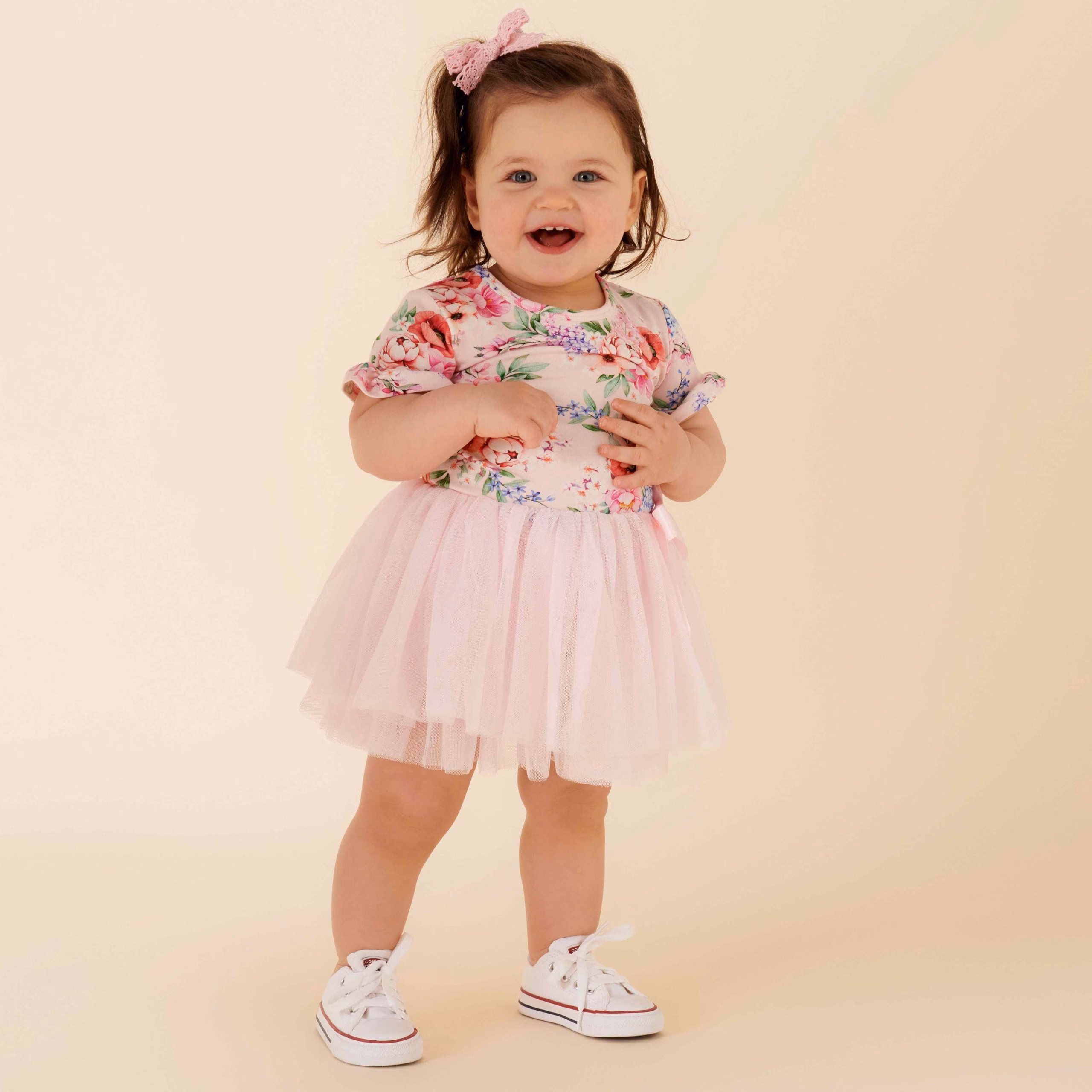 Soft cotton/elastane jersey and layered tulle tutu skirt, complimented by a satin bow at the waist. Perfect for your little princess’s next special occasion, birthday or party celebration.  This print comes in “Big Girls Tutu’s” up to size 8, so you can do matchy matchy for some amazing memories. Dresses that memories are made in.