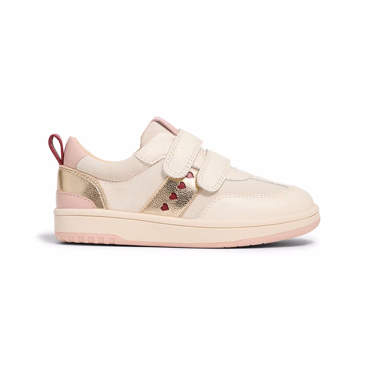 From Pretty Brave comes the new River trainer – a fresh, sporty trainer that plays as hard as they do. Made with genuine leather with fun cut-out heart details, River combines support and fun. Double hook and loop straps make them easy to put on and take off, while the padded collar and cushioned insole offer all-day comfort. Reinforced toe cap for extra durability. Podiatrist approved and made for action.