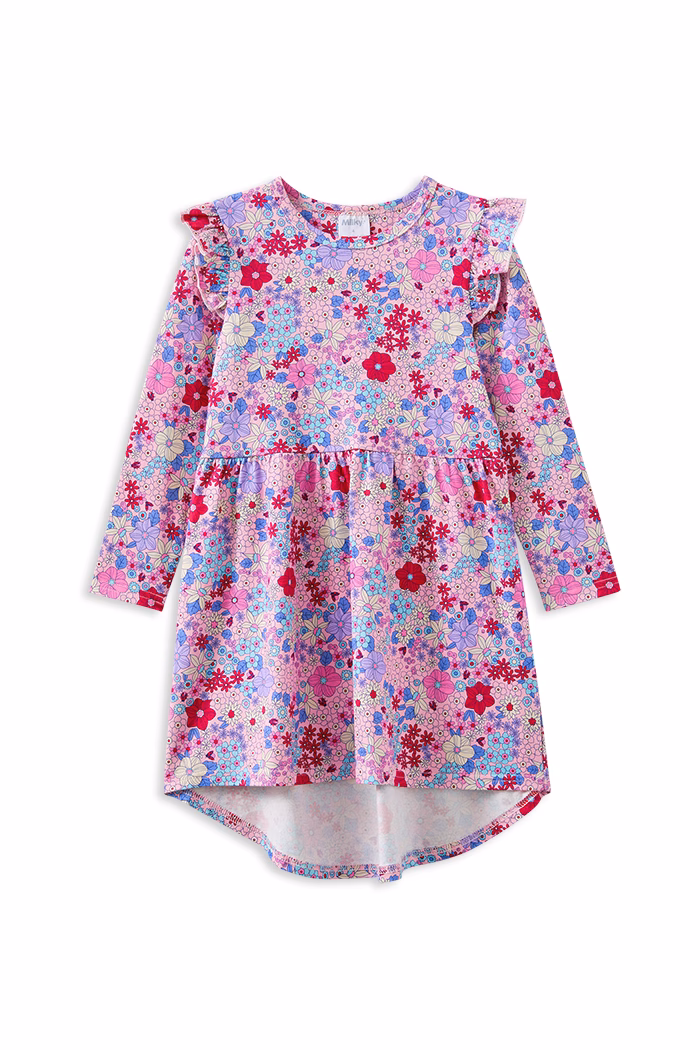 Milky Clothing Lilac Bloom Hi-Lo Dress. With an all over print this sweet dress is made with style and comfort in mind. Shoulder frills and a floaty hi-lo hemline, choose to layer with tights or go without for trans-seasonal dressing.