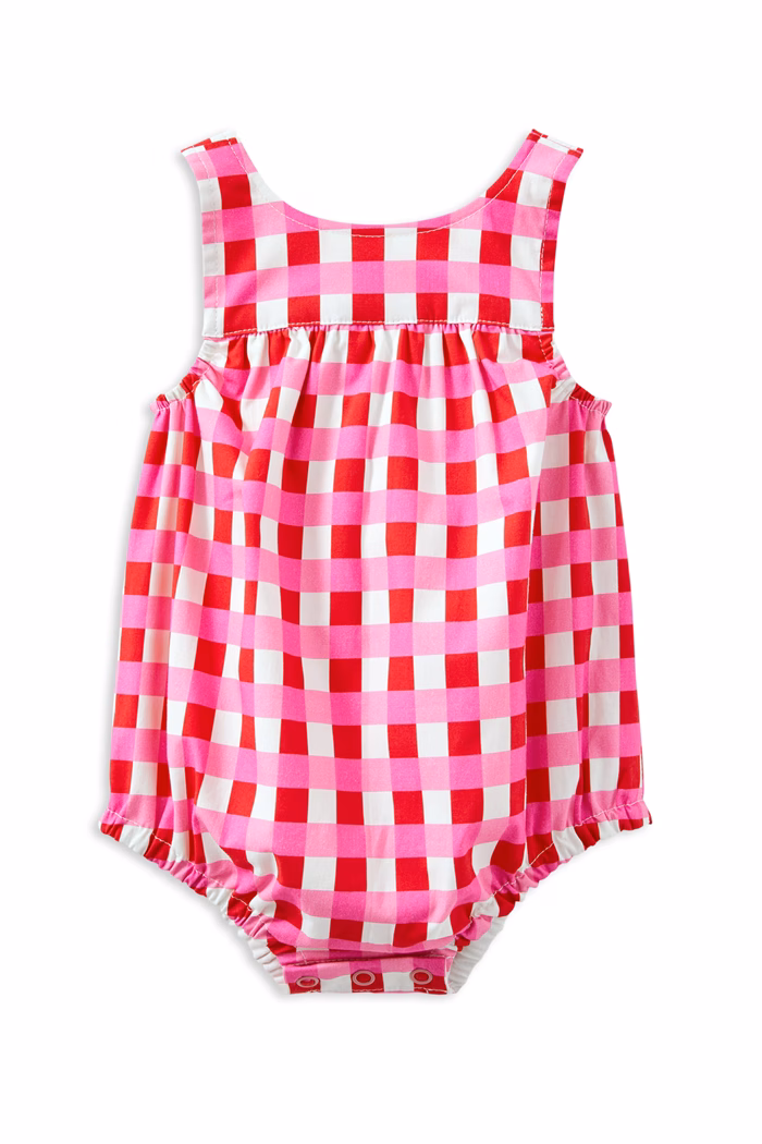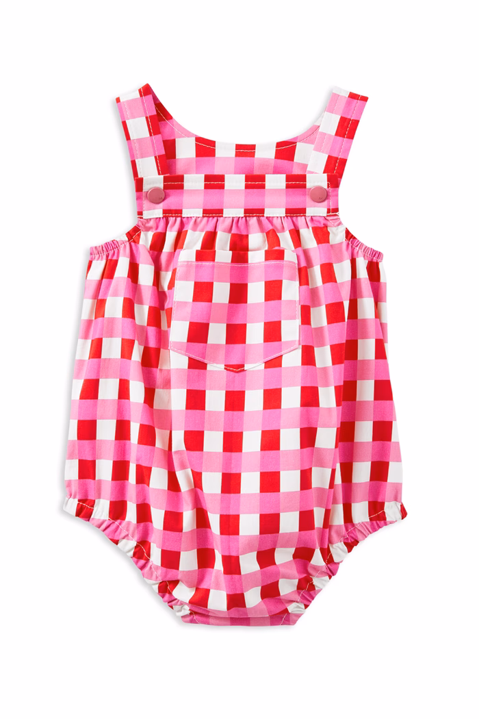Milky Clothing Lollipop Check Playsuit. Bring on the sunshine with our pink and red Lollipop Check Playsuit! Designed for all-day comfort and summer fun, this playful piece features a vibrant check print and lightweight fabric, perfect for warmer days. Shoulder snaps and crotch opening make for quick changes, while the roomy fit allows for wriggling, crawling, and exploring with ease. Pair it with a tee underneath or wear it on its own,  it’s a versatile go-to for any outing.