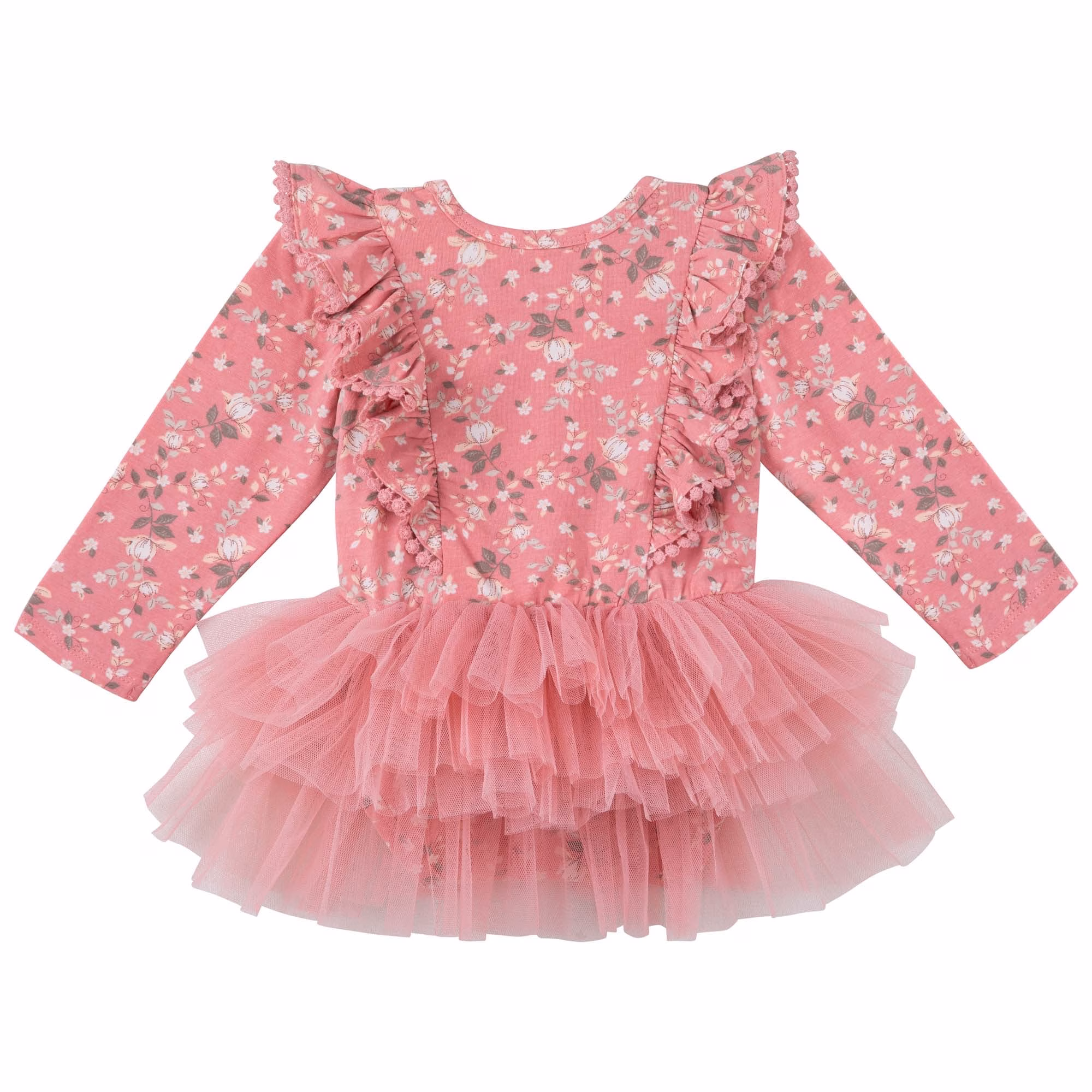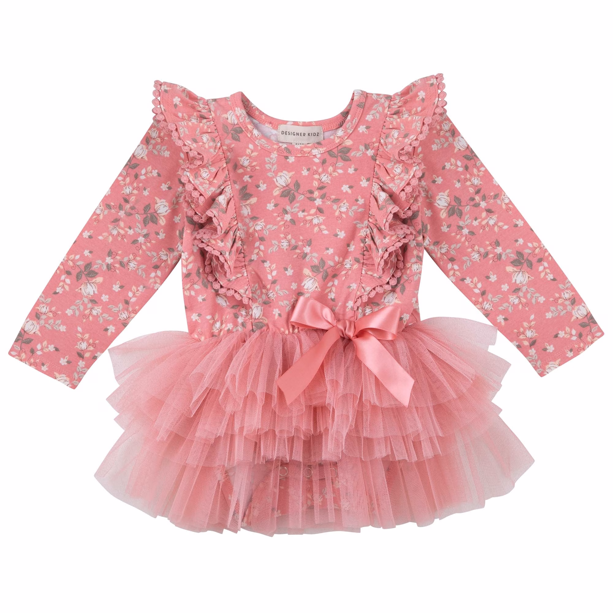 This is the Maisie Floral L/S Hazel Tutu Romper, featuring the gorgeous Maisie floral print on soft cotton/elastane jersey, shoulder ruffle detail with pom pom trim, and layered tulle tutu skirt, complimented by a satin bow at the waist. Perfect for your little princess’s next special occasion, birthday or party celebration. This print comes in “Big Girls Tutu’s” up to size 8, so you can do matchy matchy for some amazing memories.