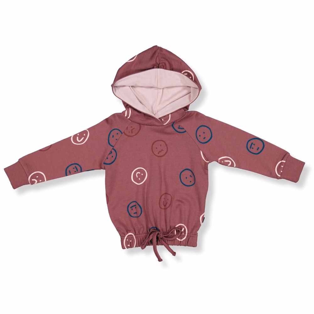 The Elyse Hooded Sweatshirt features a slightly cropped silhouette with contrast hood lining and waist tie. Raglan sleeve style with soft elastic at waist. Cute print at front to achieve ultimate style points. Made from 300gsm 100% Merino terry loop fleece.