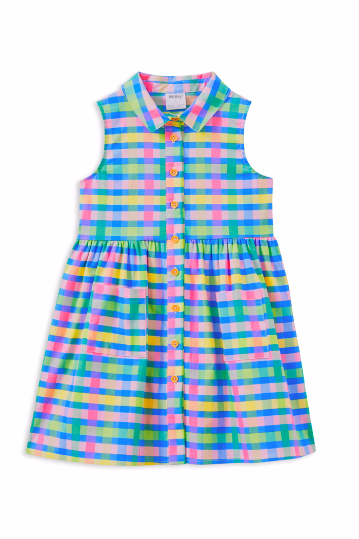Add a burst of colour to your little one’s summer wardrobe This sleeveless style features a playful all-over check print, a functional front button opening, and a gathered waist for a relaxed, twirl worthy fit. Lightweight and breezy, it’s perfect for warm days filled with play, parties, or park picnics.