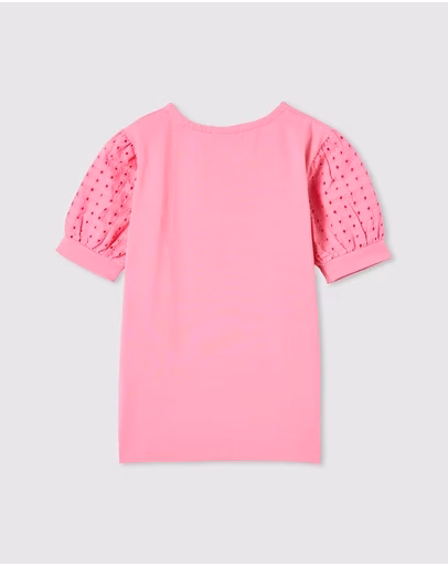 Milky Clothing Broderie Sleeve Tee. The stunning Begonia Pink Broderie Anglaise fabric is featured on the sleeves of this cotton blend tee. With gathering at the shoulder to create a puff sleeve, this sweet tee will be a go to for summer.