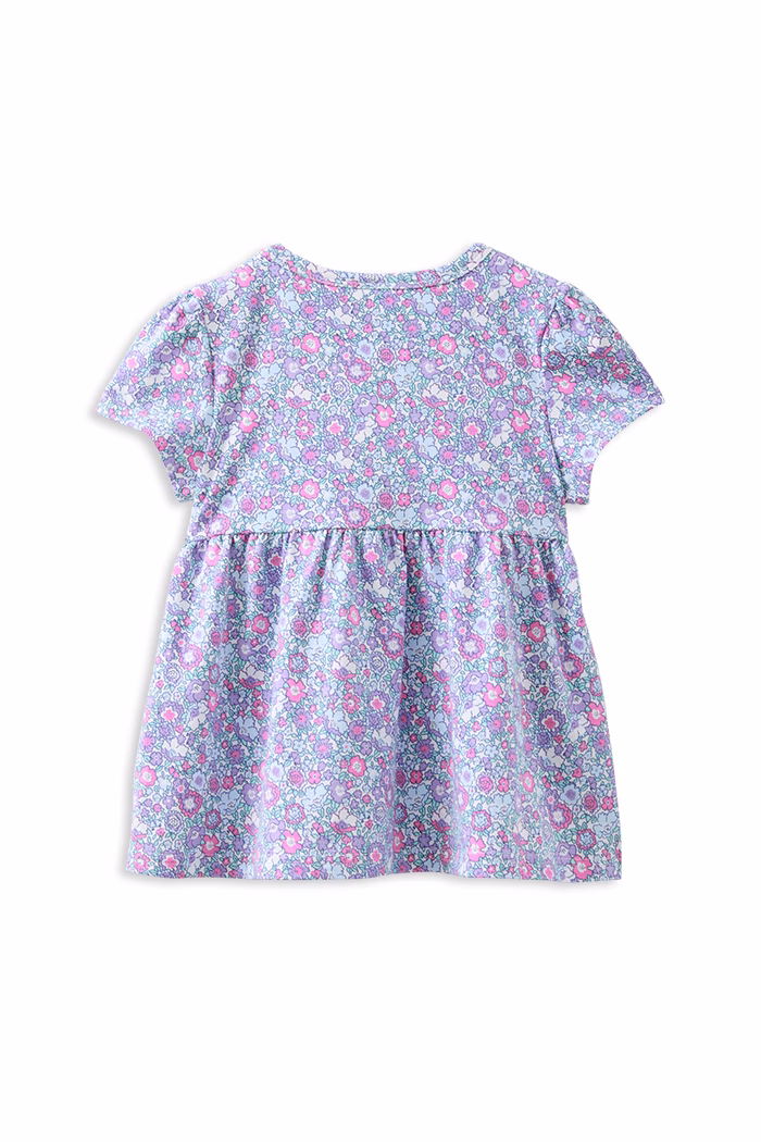 Pretty Posy Swing Tee is the perfect fun and flowing addition to your little one’s wardrobe. Crafted from a soft cotton-rich blend, this sweet tee features a delicate floral print in shades of purple and pink. With short sleeves and a gathered waistline, it offers a flattering, airy fit that’s perfect for twirling. Pair it with the matching Pretty Posy Bike Shorts for a coordinated, trendy look, or team it with your favorite Milky shorts or leggings for a breezy, effortless style. This versatile tee is sure to keep your little one both stylish and comfortable all day long.