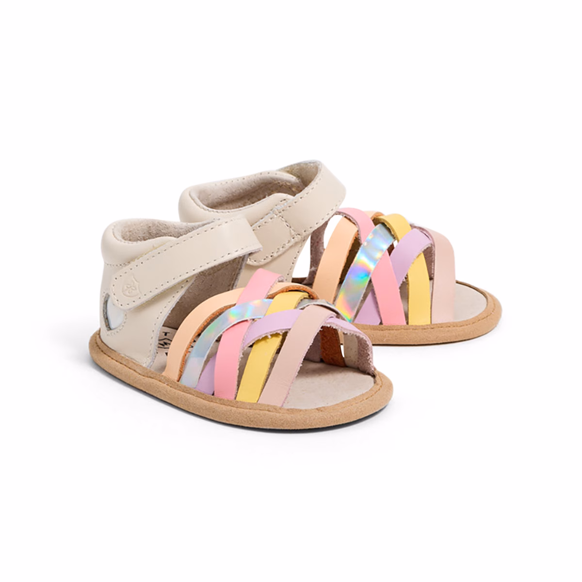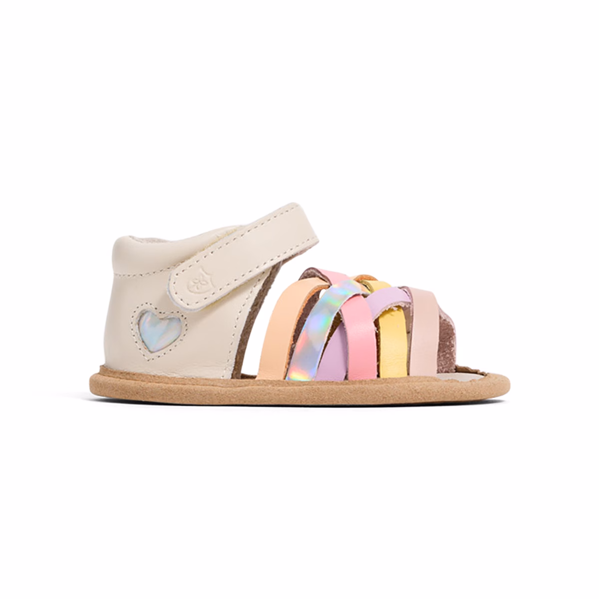 Meet Baby Ariel. Featuring a beautifully designed interlaced front with rainbow-coloured straps and a shimmering heart underlay at the sides, Ariel is a must-have for baby girls this summer. A padded heel and fully adjustable strap provide comfort and ease of wear.