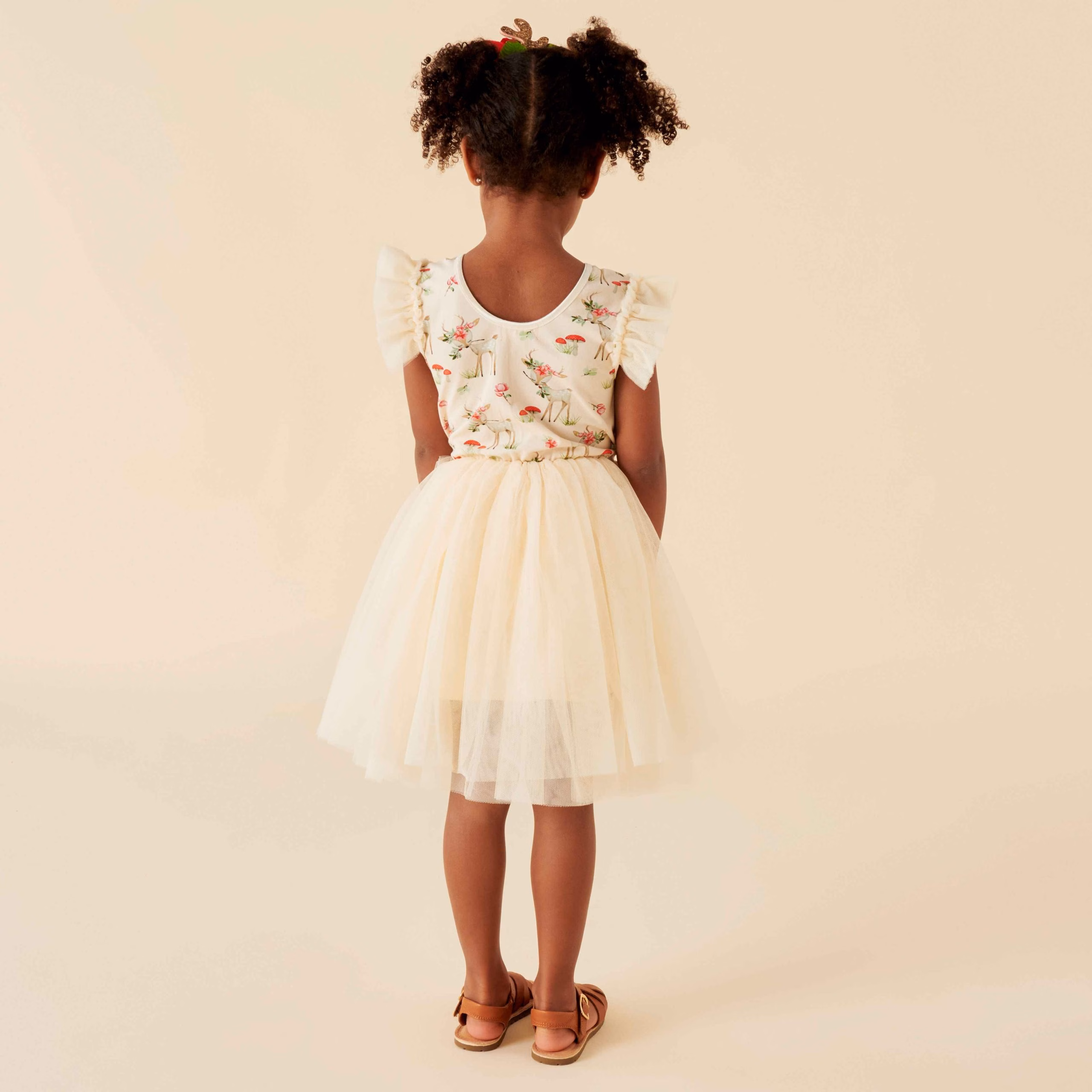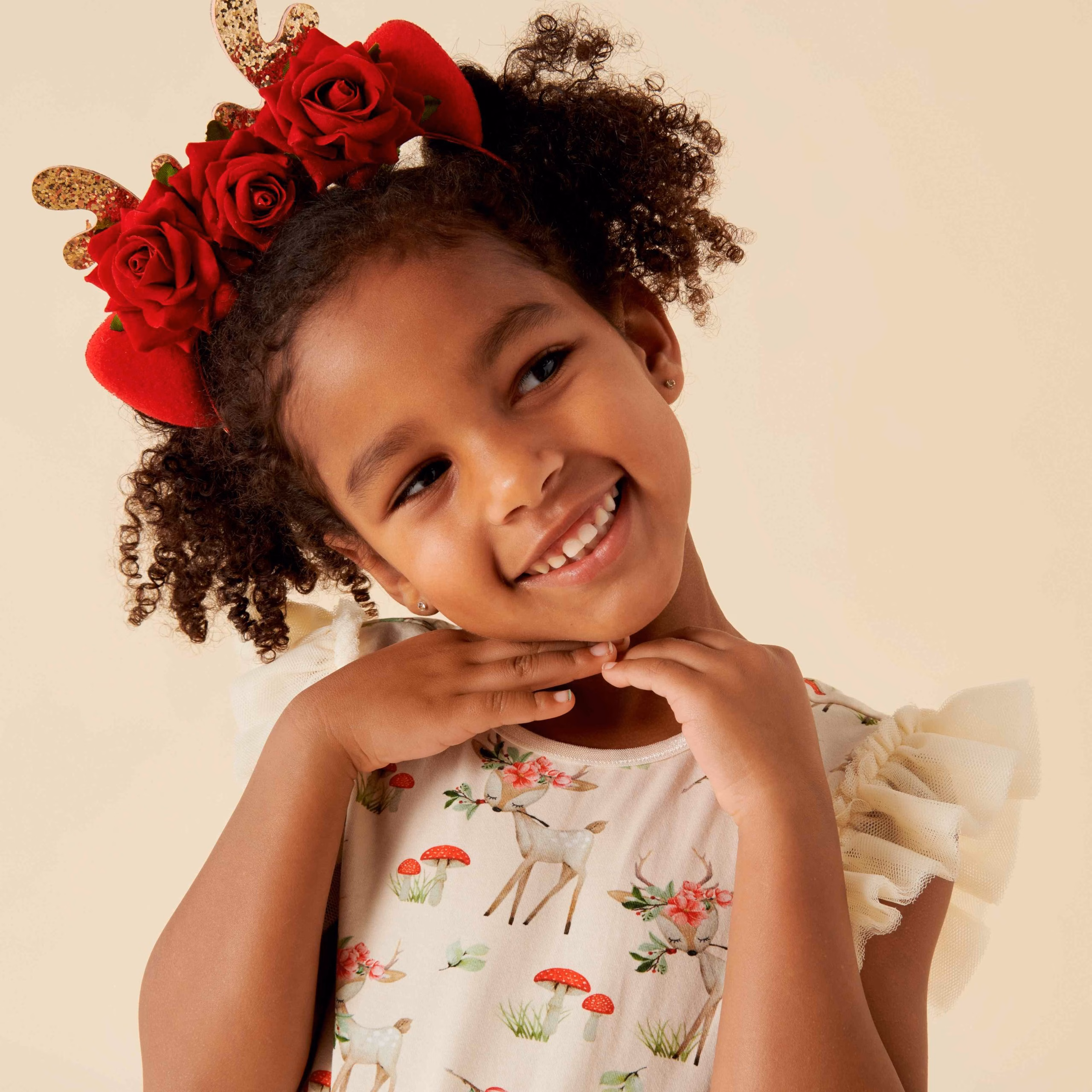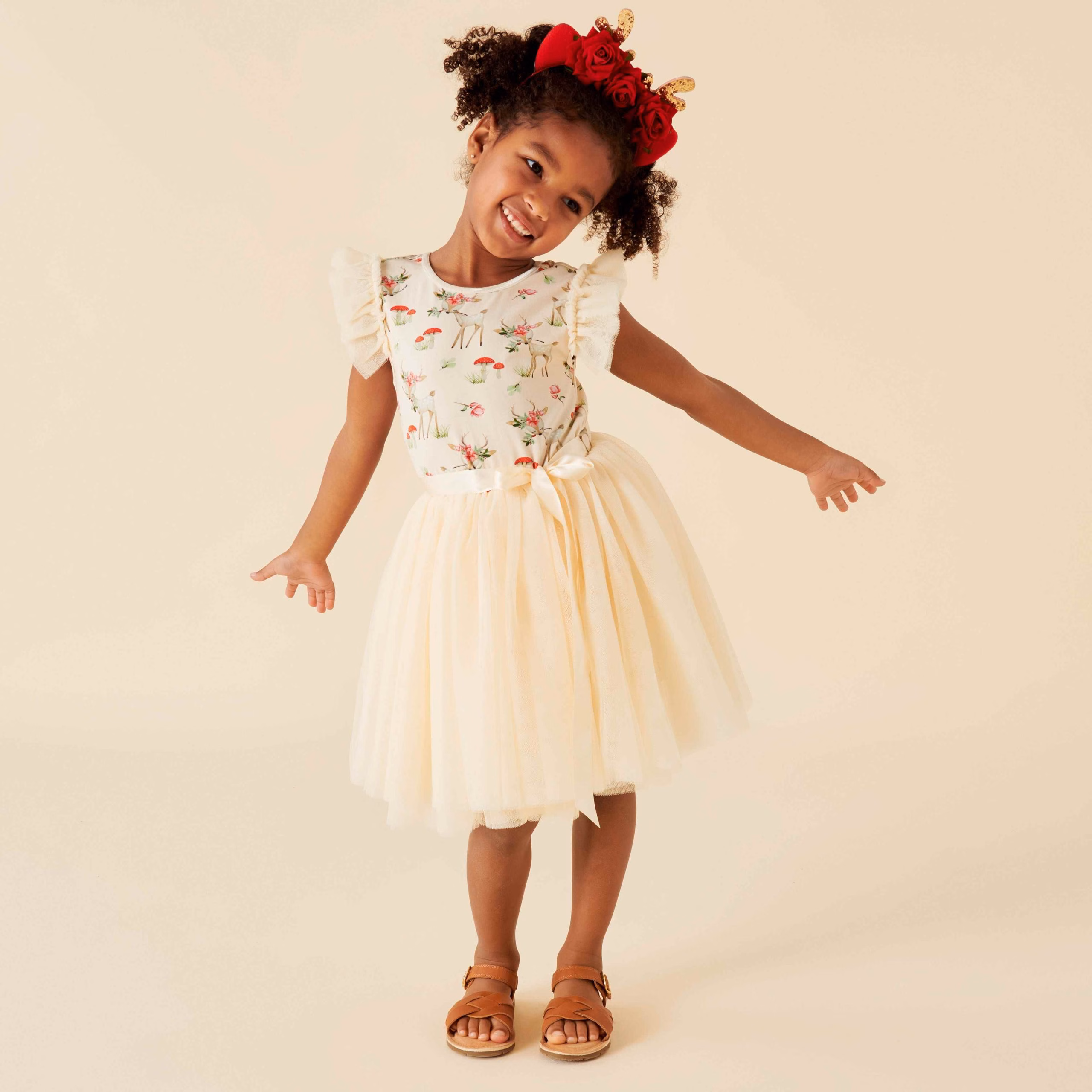This beautiful tutu dress features sweet reindeer designs short sleeve shoulder frills all tied up with a matching bow.