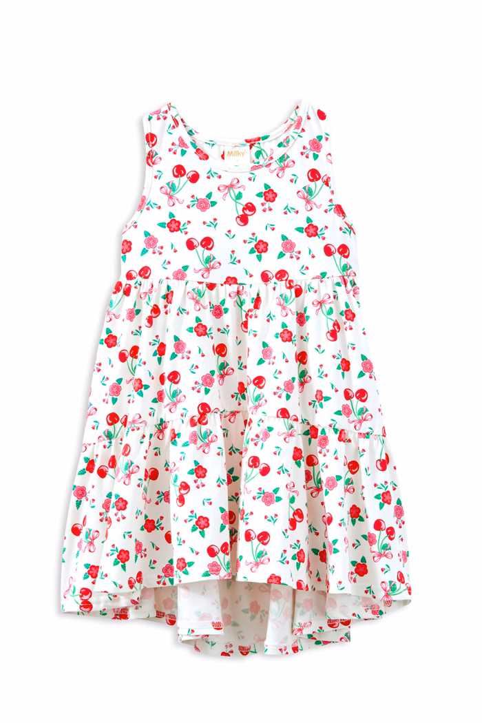 This sweet cherry dress by milky is as sweet as summer itself. It Features a playful all-over print of cherries and bows on a crisp white base, this racerback dress is lightweight making it perfect for twirling and warm-weather fun. With a tiered skirt for extra movement and an easy pull-on fit, it’s an ideal pick for parties, park days, or cherry-picking adventures.