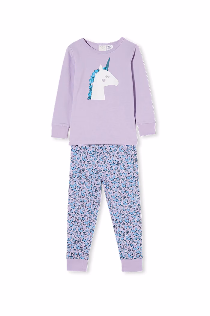 Milky Clothing Unicorn pj’s are super cool and comfortable. These girl’s long sleeve pyjamas have a lilac base top with a unicorn print on the centre front. The bottoms have a floral all over print which tie back with the print to the top. Look no further for the perfect sleepwear.