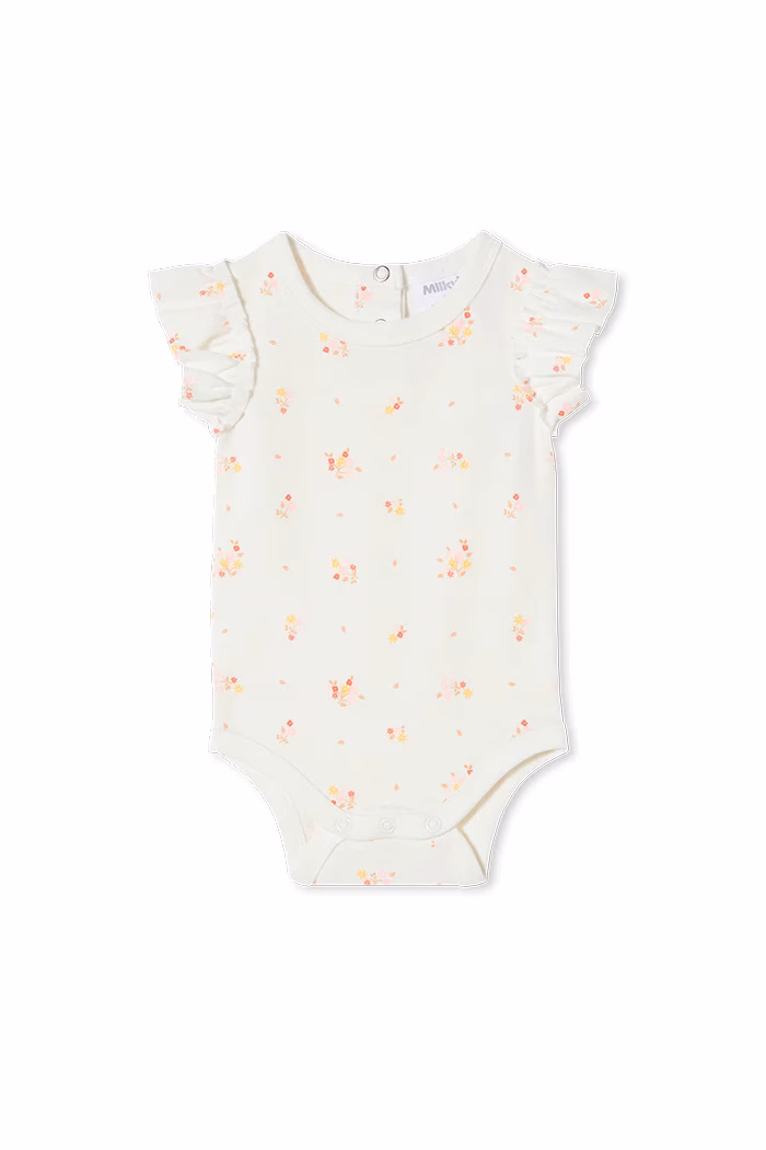 Milky Clothing Rib Bubbysuits are the perfect staple for your little ones wardrobe. This classic bubbysuit features all over flower print and back neck opening with snaps for a neat fit. The short sleeves with sweet frill is an easy to wear summer piece. This versatile bubbysuit can be worn alone and also be layered with pants or a cardigan during the cooler weather.